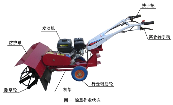 重慶華偉聯龍170F/P汽油機一臺,行走膠輪和幫助行走膠輪各一副,旋耕刀輥一副,鋤草刀輥一副,開溝可調式雙面犁1把。